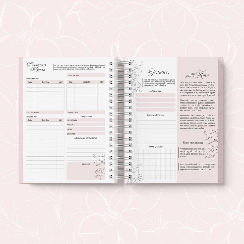 Capa dura, tamanho A5, 1 dia por página, 406 páginas de 75g e envelope canguru.