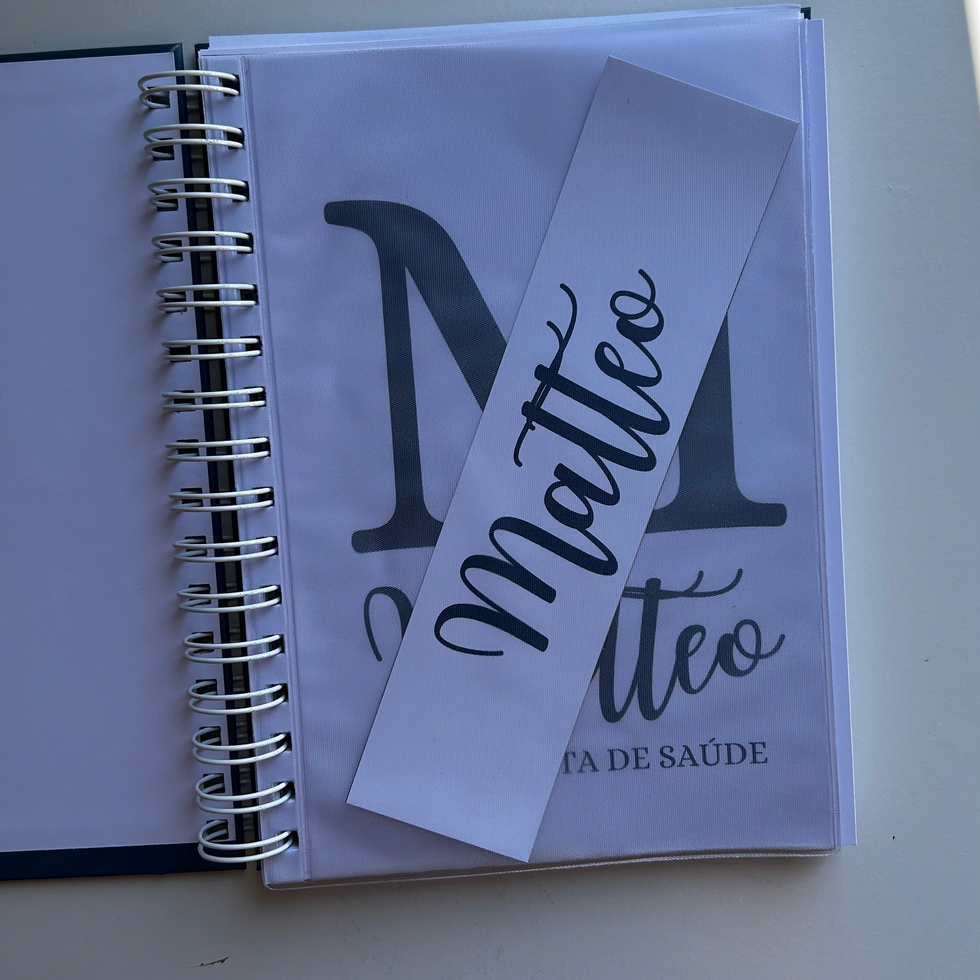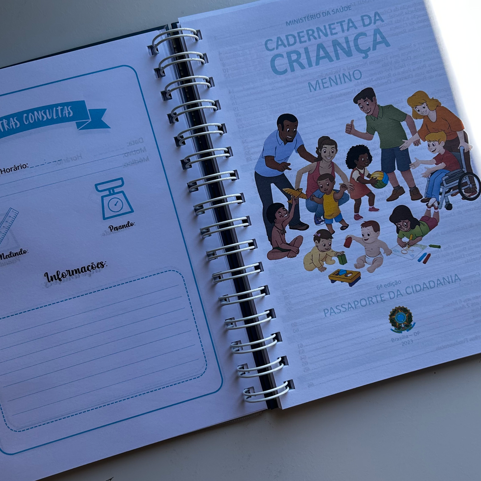 Capa dura, tamanho A5, páginas de 90g, miolo oficial do SUS com cor combinando com a capa, folhas extras de consultas médicas, envelope canguru, barbante combinando com a capa e chaveiro de polaseal na mesma temática da capa.