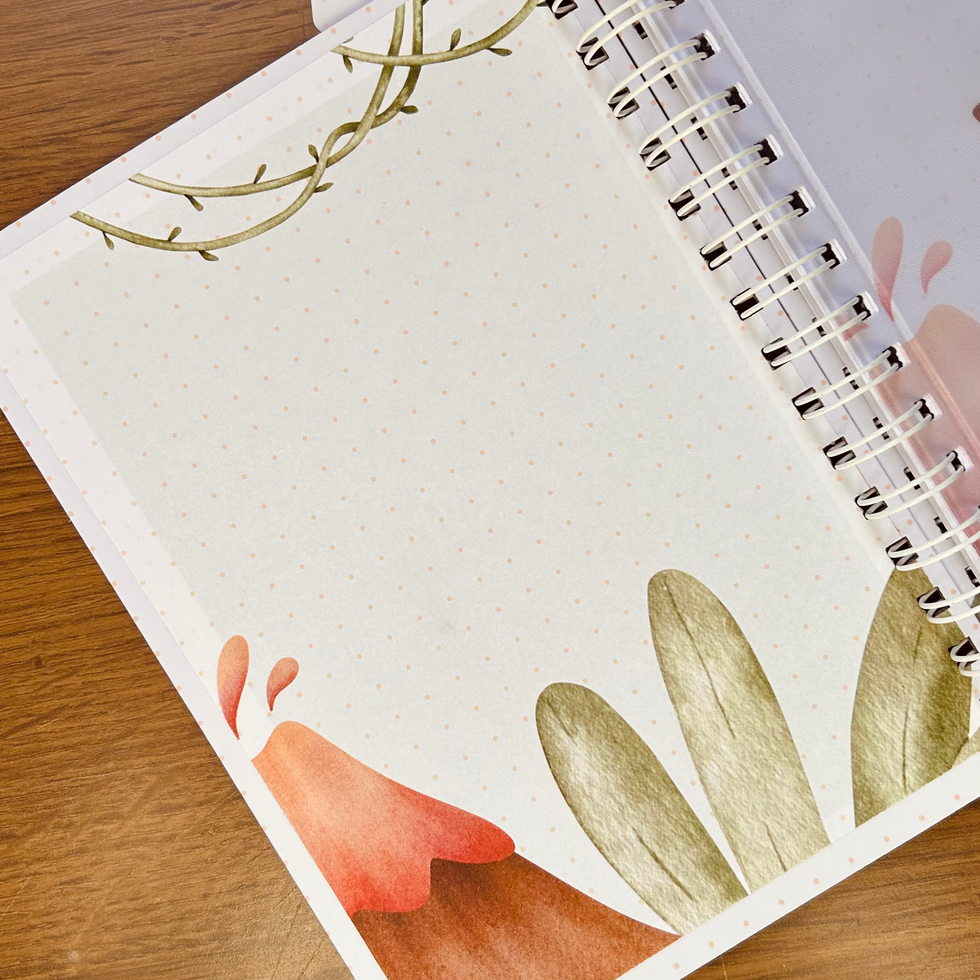 Capa dura, tamanho A5, páginas de 90g, miolo oficial do SUS com cor combinando com a capa, folhas extras de consultas médicas, envelope canguru, barbante combinando com a capa e chaveiro de polaseal na mesma temática da capa.
