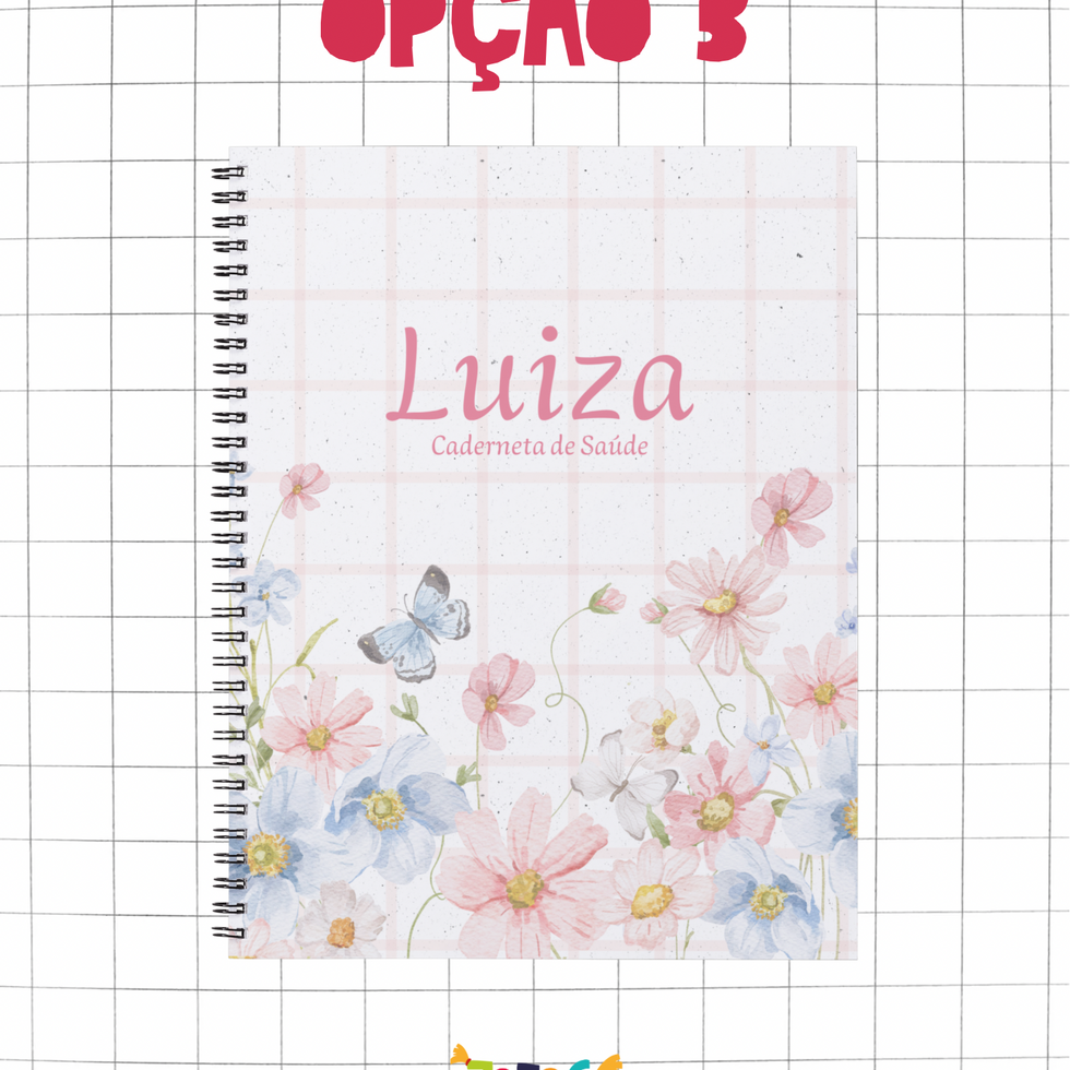 Capa dura, tamanho A5, páginas de 90g, miolo oficial do SUS com cor combinando com a capa, folhas extras de consultas médicas, envelope canguru, barbante combinando com a capa e chaveiro de polaseal na mesma temática da capa.