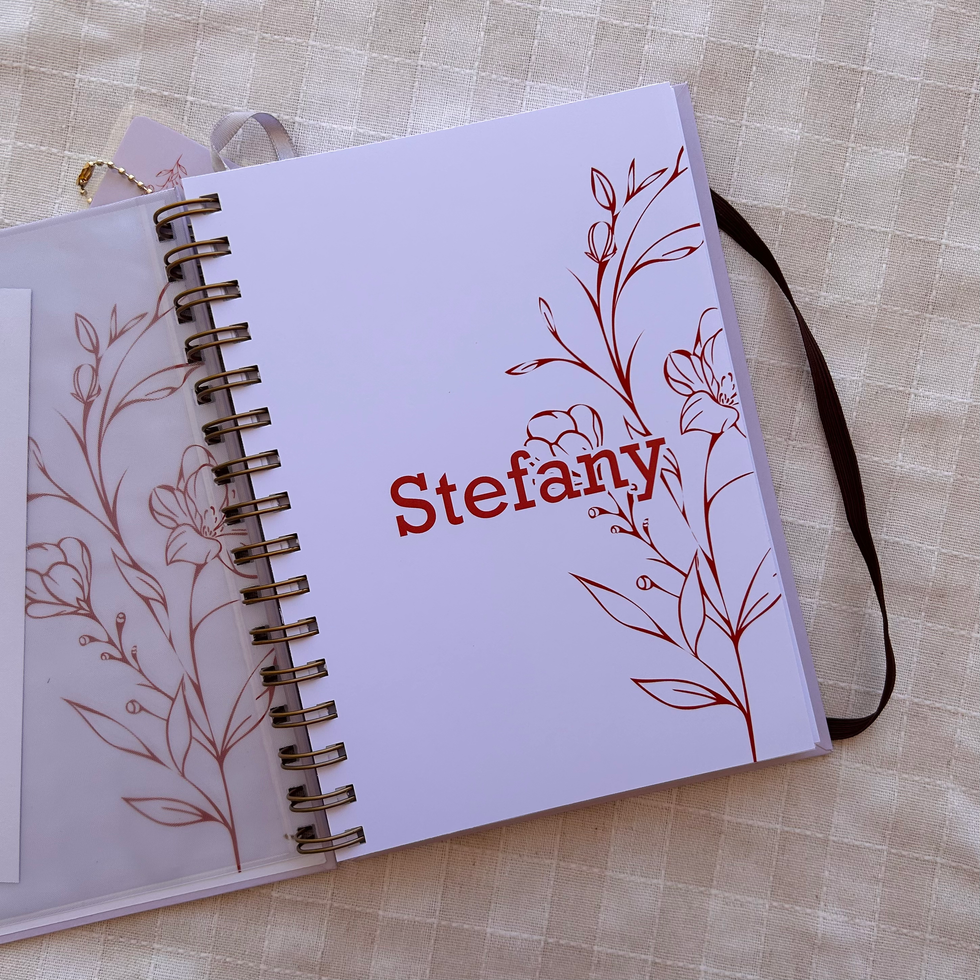 Capa dura, tamanho A5, 200 páginas de 90g e wire-o combinando com a capa.