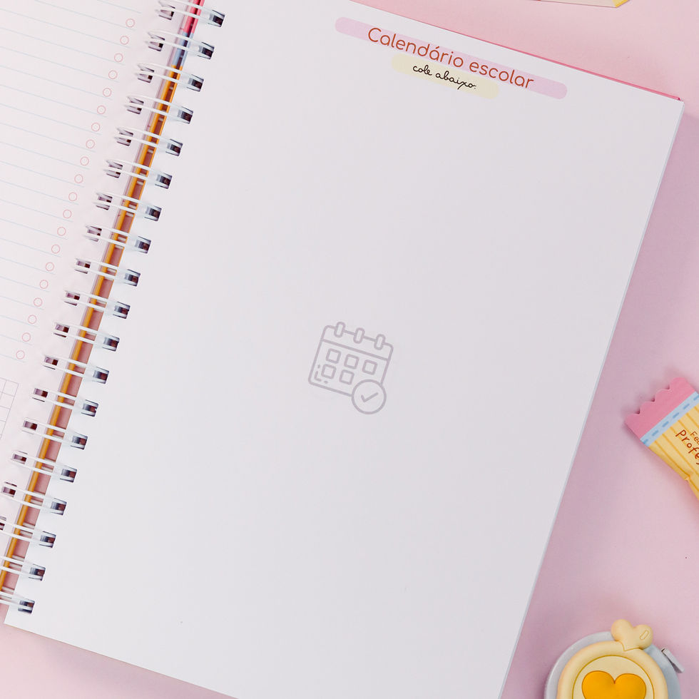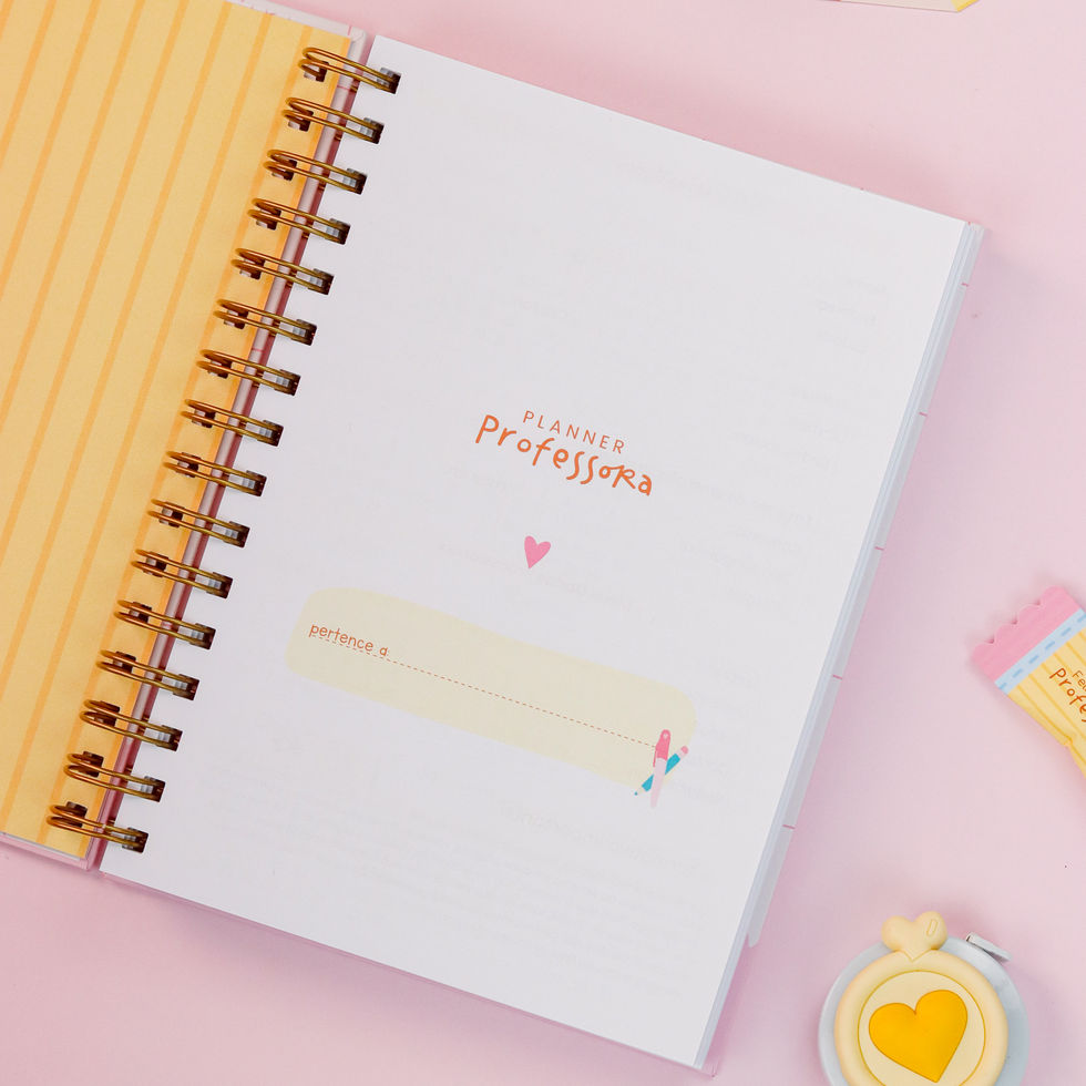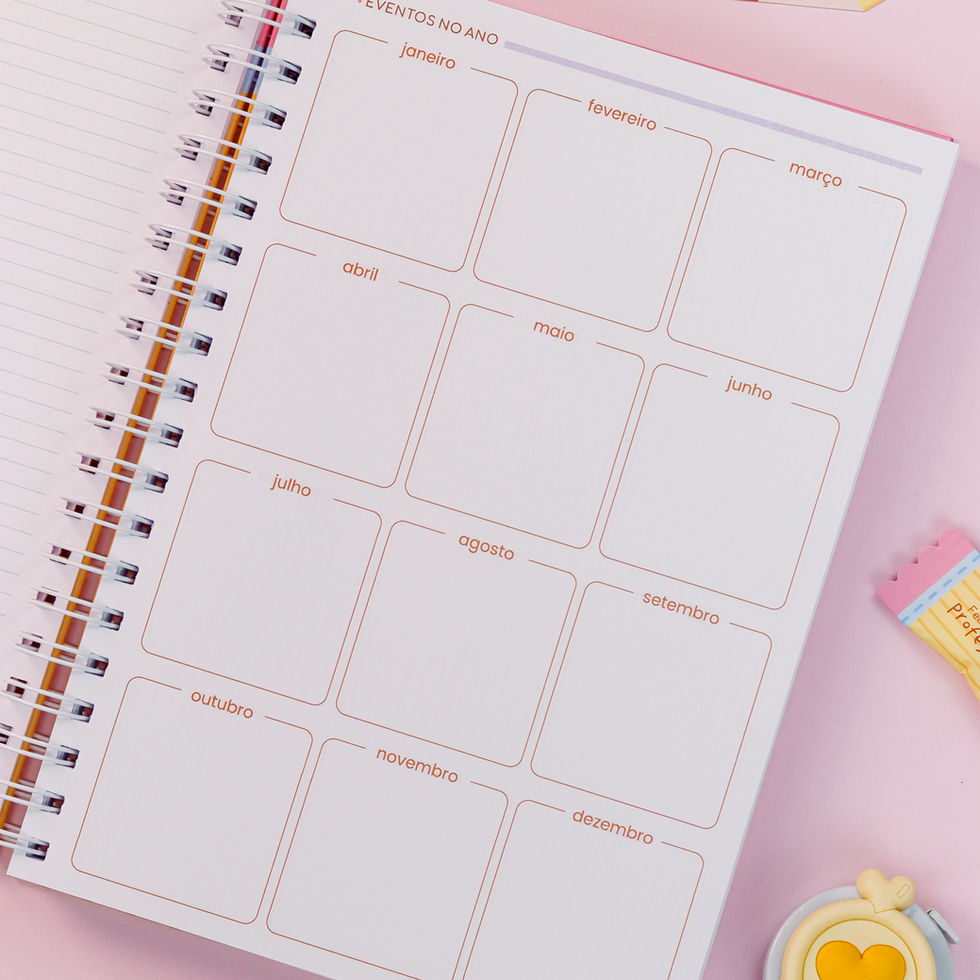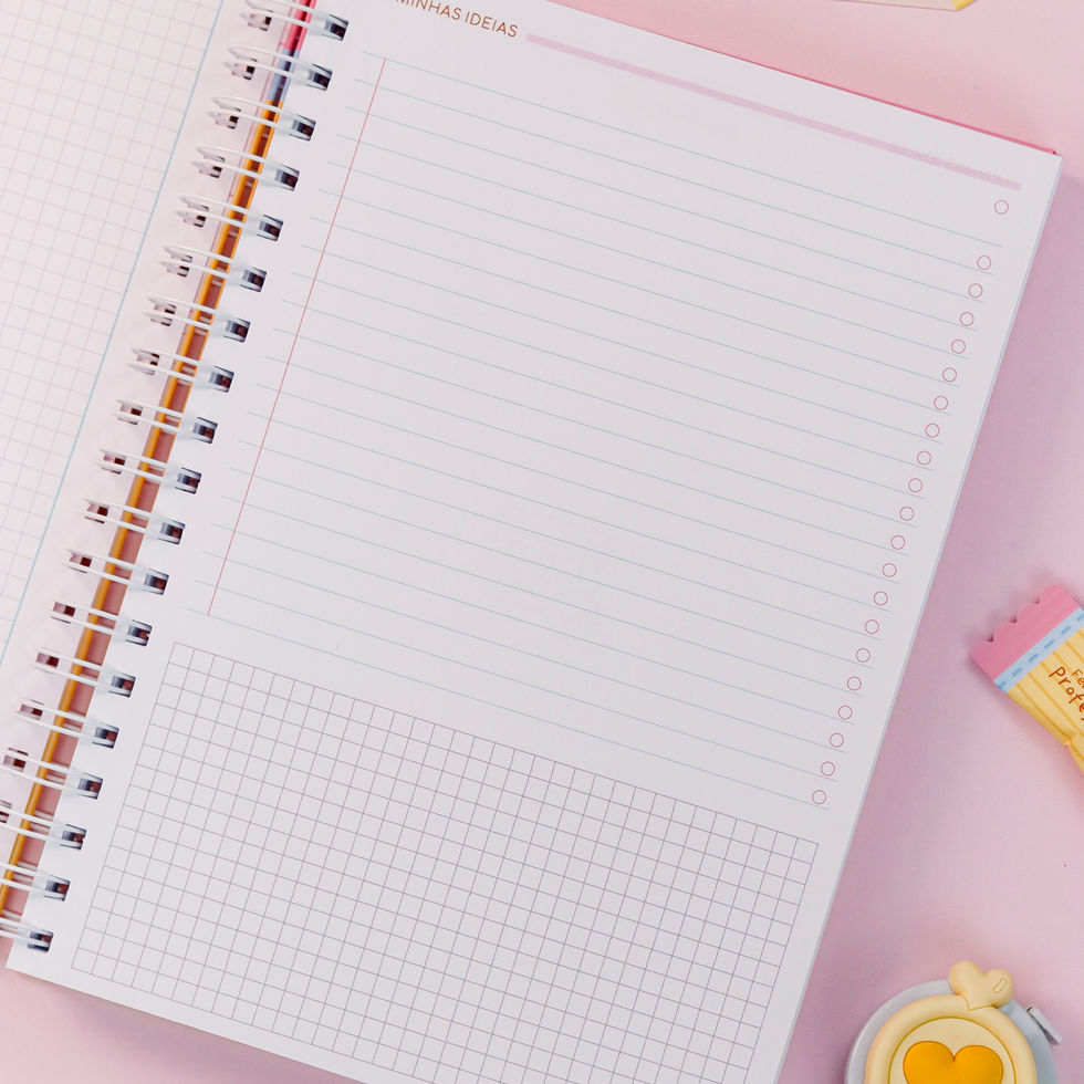 Capa dura, tamanho A5, 310 páginas de 90g e wire-o combinando com a capa.
